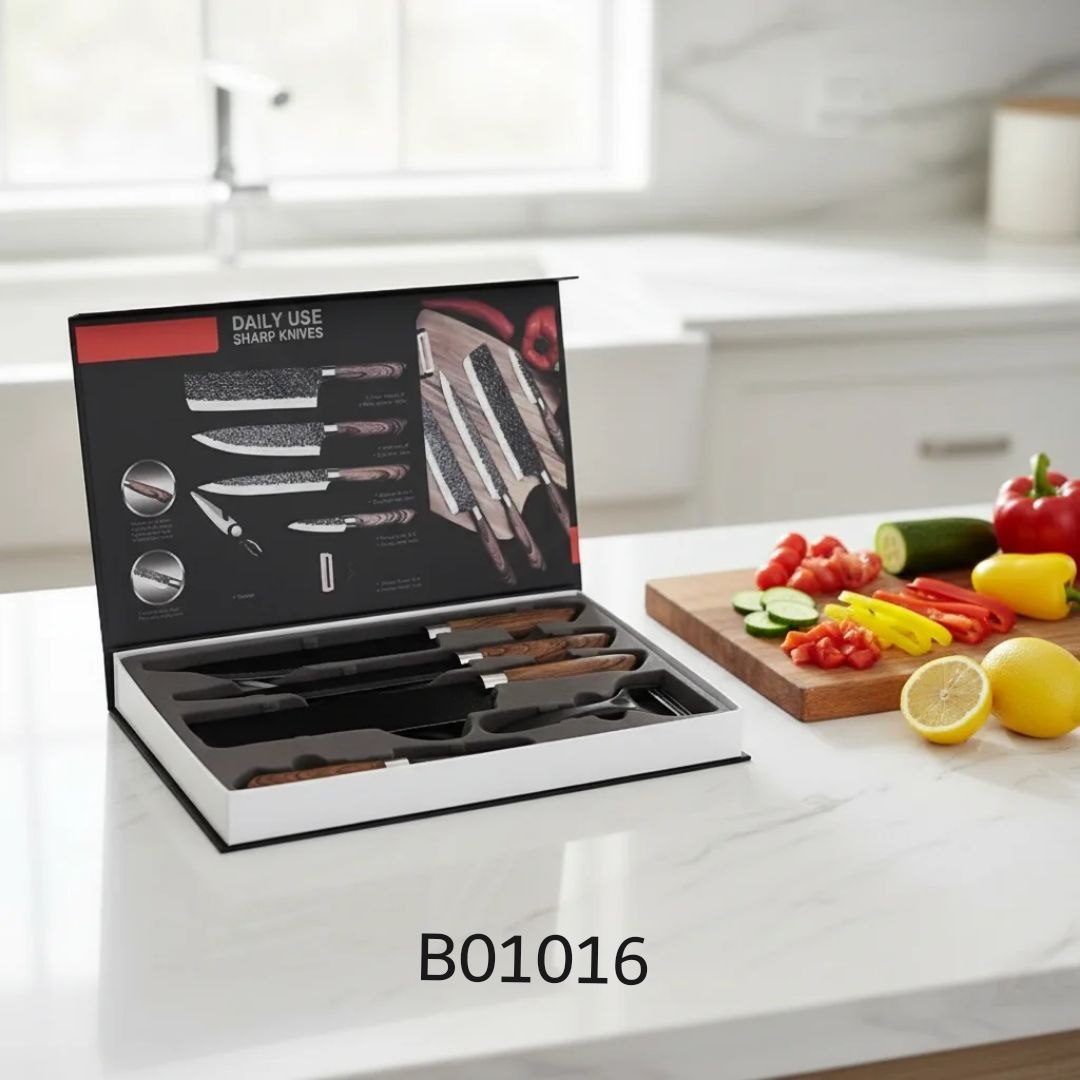 علبه ادوات مطبخ6 قطع به مقص و مقشره و 4 مقاسات سكين مختلفه